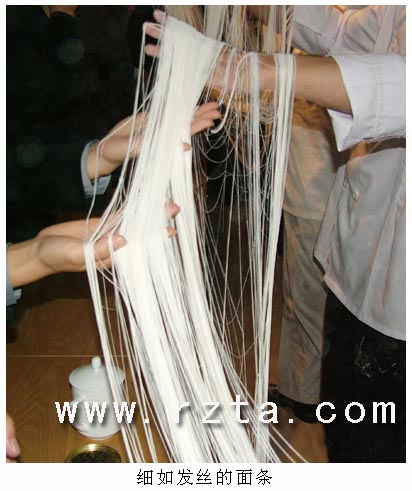 上午11点左右,在日照金海花园大酒店,厉恩海先生向人们展示了一分钟拉出209万根面条的绝技。厉先生拿着原本手腕粗的面,魔术般地变化着形状,一会儿在头顶上绕来绕去,一会儿在胸前翻抖拉扯,逐渐把面团变成如蛛网、蚕丝的面条。他的一招一式不时地吸引来宾阵阵叫好声。短短十分钟,一团面就变成了细如发丝的面条,如同瀑布飞泻,令人叹为观止,人们纷纷忍不住用手触摸,感受这面食技巧的绝妙。