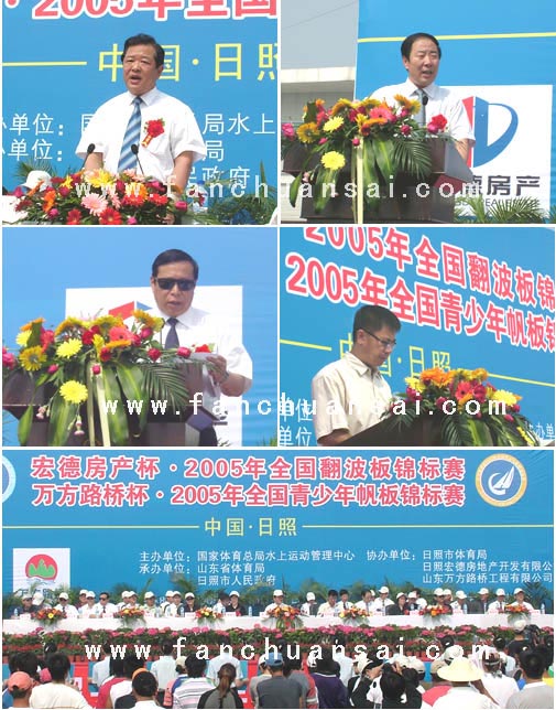 由国家体育局水上运动中心主办、山东省体育局和日照市人民政府承办的“宏德房产杯” 2005年全国翻波板锦标赛、“万方路桥杯”2005年青少年帆板锦标赛经过精心筹备,于6月12日上午九点隆重开幕,组委会执行主任、国家体育总局水上运动管理中心一部部长、中国帆船帆板运动协会秘书长李全海,组委会副秘书长、中国帆船帆板运动协会副秘书长周长城,组委会副主任、山东省体育局综合业务处副处长谈文新,组委会执行主任、日照市人民政府副市长解世增,组委会副主任、山东省水校校长隋拥军,组委会副主任、日照市体育局局长赵文胜出席参加开幕式。 中共日照市委副书记、市纪委书记李敏,日照市人大常委会副主任蔡建华、日照市政协副主席刘风仙、中共日照市纪委副书记刘彦芝、日照军分区副总司令员韩继亮到会出席祝贺。 随着雄壮的中华人民共和国国歌《义勇军进行曲》激昂地响起,日照市人民政府副市长解世增首先发表了热情洋溢的欢迎词。他说,日照是一座环境优美的生态城市,素有“蓝天、碧海、金沙滩”之美誉,日照更是一座充满活力的时尚城市,拥有亚洲第一、世界领先的水上运动基地,适合开展各类水上运动,也是发展游艇等海上休闲运动的理想之地。解市长说,这次全国两项赛事的举办是今年水上运动的重要赛事,对于推动我国帆船、帆板运动的更快发展,促进日照“水上运动之都”建设,有着重要的意义。 组委会副主任、山东省体育局综合业务处副处长谈文新在开幕式上发表重要致辞。他说,近年来,在国家体育总局的正确领导下,山东省全面贯彻落实全民健身计划纲要,大力实施奥运争光战略,群众体育蓬勃发展,竞技体育水平不断提高,体育产业成效显著,山东还取得了十一届全运会的承办权,正在由“体育大省”向“体育强省”跨越。谈处长说,日照市“唱体育戏,打赛事牌”,体育事业得到快速发展,“水上运动之都”建设步伐不断加快,这两项全国赛事在日照的举办,成分体现了国家体育总局对山东、对日照的支持和厚爱,我们将以此次赛事为契机,提高工作,增进友谊,为我国翻波板、帆板运动的普及和提高,为建设大而美、富而强的新山东做出积极贡献。 组委会执行主任、国家体育总局水上运动管理中心一部部长、中国帆船帆板运动协会秘书长李全海在开幕式上要求参赛队员努力拼搏,奋勇争先,为中国帆板运动的发展做出新的贡献。他说,日照市拥有“亚洲第一、世界领先”的水上运动基地,这里风景秀丽,气候宜人,是开展水上运动竞技、水上时尚休闲旅游和水上科技教育的理想之地。相信通过一系列水上赛事活动的举办,水上运动在全国、在山东、在日照会有更快、更好的发展,不远的将来,日照必将成为一流的“水上运动之都”。 比赛由中共日照市委副书记、市纪委书记李敏宣布正式开幕,顿时礼炮齐鸣,礼花飞舞,和平鸽带着对中国体育事业、对全体运动员的美好祝愿展翅腾空而起。