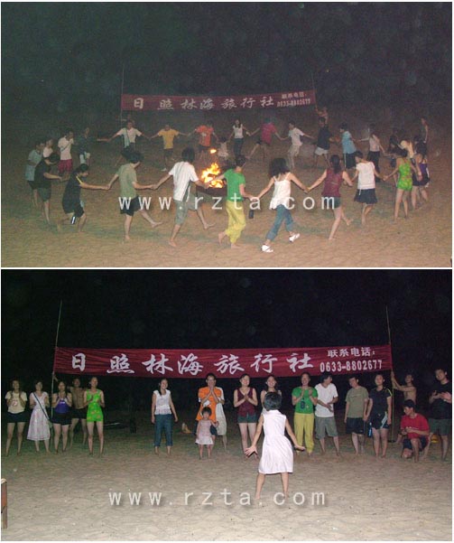 8月16日晚,乔家墩子海水浴场一片欢声笑语。日照林海旅行社组织旅游团队在此举行篝火晚会。游客自编自演的小节目不时地博得了观众们的阵阵欢呼,同时也消除了游客的旅途劳顿。面对浩瀚的大海,游客们前呼后拥、比肩而舞,围着篝火转着圈圈;嘴里还不停地和着音乐,哼着小曲,自由自在地抒发着对大海的无限感慨。夜色已深,身体疲倦了,但海天一线的美景却触动着大家欣喜的内心,欣喜硬是在疲倦的面庞中撕开了一条大口子,钻出了一个个满足的笑意。