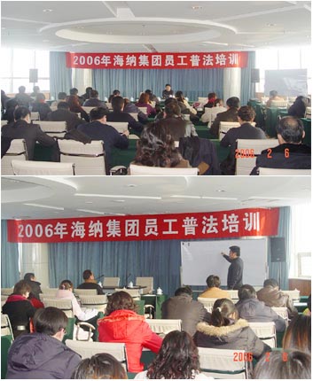 旺年伊始,瑞雪迎门。2月6日上午,为期三天的2006年海纳集团员工普法培训在海纳建国君豪酒店阳光厅开讲。 此次普法培训旨在增强全体员工学习意识,提高法律意识,由公司法律顾问太阳律师事务所主任王伯钊主讲,公司各项目、各部室人员及各下属公司中层以上的员工近百人参加了培训。 王律师从法律基本知识、民法、合同法等房地产有关法律法规做了总体讲述,并结合大量生动的案例对商品房销售合同、工程类合同的签订和管理做了专题讲解,让广大员工特别是营销和工程管理人员学会如何从法律的角度保证业合同的合法性、正确性与规范性,从而避免和减少法律纠纷,更好地维护公司和客户的利益。