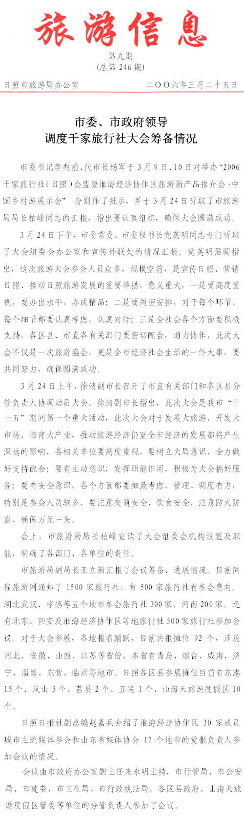 市委、市政府领导调度千家旅行社大会筹备情况(2006年03月28日)