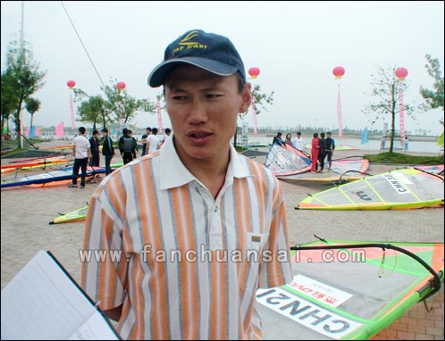 6月23日,全国青少年帆板锦标赛已经进行到第四天,由于风力不足比赛不能如期进行,岸上排起了等待的帆,参赛运动员也都在岸上进行等待。当天上午山东队教练陈占营接受记者采访。 谈到此次比赛,陈占营说:“这次比赛共八个项目,我们参加了五个,其中男子公开级,女子甲、乙组米斯特拉级我们将在这三个项目上冲击金牌。山东队前几轮比赛成绩不是很理想,但昨天成绩很不错,我们山东队取得了一个第一名(公开级短板组山东队的朱锦玉竞得),两个第二名,在冲击金牌项目上我们还是有信心的。这次比赛结束后就要准备全国帆板锦标赛。 谈起日照比赛场陈教练肯定地说当然是一流的,日照比赛设施无论从是硬件还是软件都可以说是最好的,来日照比赛我们也很高兴。 在培养帆板队员方面陈教练说:“一个优秀的帆板队员不仅是体能、技能体现,还要有一定的文化素质,这样在接受技能训练上也比较快。同时我们还联合省内的一些高校,一些成绩好的队员我们可以送去培养,让我们的队员更优秀,在比赛中取得更好的成绩。同时,搞帆板运动也是一个很辛苦的,不论刮风下雨、天寒地冻都要在风浪中训练,这就是要付出一定的代价。一个帆板选手的个人牺牲是常人不能想象的,搞帆板运动太苦了!