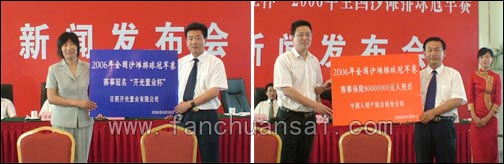 最后,大会组委会后勤保障部部长、日照市体育局纪检书记徐永琴与开光置业有限公司董事长范开光签署2006年全国沙滩排球冠军赛冠名协议。大会组委会宣传处副处长、日照市体育总会副主席申家新与中国人民财产保险股份有限公司日照市分公司副总经理刘波签署了赛事公众责任保险协议。