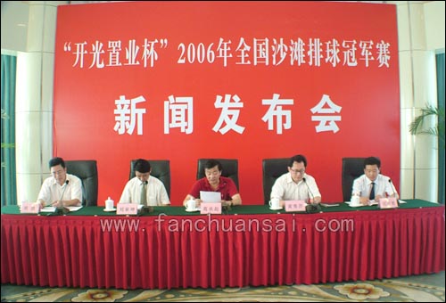 会上,山东省体育局排球运动管理中心葛承起宣读了“国家体育总局排球运动管理中心关于在日照市召开2006年全国沙滩排球冠军赛新闻发布会的批复”。日照市体育局副局长刘家坤发表讲话,他说: 2006年全国沙滩排球冠军赛将是全国优秀选手和后备人才竞技水平的一次集中检阅,对于促进中国沙滩排球运动的发展具有十分重要的意义。从7月4日起运动员报名到7月9日闭幕,历时7天,必将为日照旅游营造更加浓厚的氛围,让大家充分享受沙滩排球的魅力和乐趣,也必将为进一步宣传日照,提升城市品牌形象,促进日照经济和社会各项事业的发展具有积极的意义。