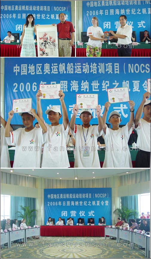 经过二十天的培训,2006年日照海纳世纪之帆夏令营活动各项培训内容圆满结束。7月28上午,在海纳建国君豪举行闭营仪式。市体育局党组织成员体育总会副主席申家新,海纳集团总公司副总经理徐志厚,永安财产保险股份公司日照中心支公司总经理周祥诺,中国航海商务组织办公室主任张晶,市教育局执政科科长石磊出席了闭营仪式。 申家新在讲话中对本届夏令营做了总结,本届帆船夏令营的成功举办,不仅使孩子们对航海产生了兴趣,也引起了广大学生家长和社会各界的关注。活动至今历时20天,培训工作进展的非常顺利,成果显著,圆满完成了各项活动内容。对打造水上运动之都,普及青少年帆船知识起到了积极的作用。 在闭营仪式上周详诺、石磊给营员们颁发国际帆船联合会认证的航海技能证书。芭芭拉向日照海纳集团颁发了纪念品。 通过本次夏令营活动,营员们不仅掌握了帆船驾驶技术,也培养了他们不畏艰险的顽强拼搏精神,这对孩子们今后的成长发展起到积极的作用。