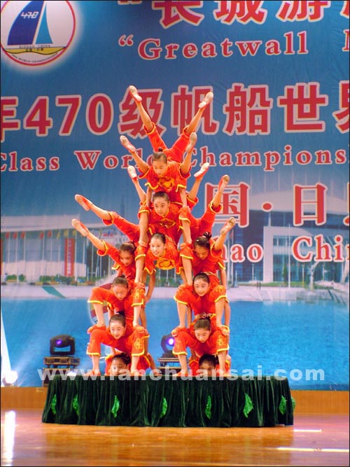 9月6日晚的港城,海风送爽,万众欢腾。“长城游艇杯”2006年470级帆船世界锦标赛开幕式及文艺演出在日照市会展中心隆重举行。精彩的文艺节目赢得观众阵阵掌声。 伴随着欢乐的乐曲,在470级帆船世界锦标赛的巨幅蓝色背景下,富于中国特色的舞狮表演充分把中国传统文化之美展示给了各国运动员和官员——文艺演出由此拉开序幕。杂技《顶碗》、《绸吊》、《博—倒立技巧》、《磴人空竹》等精彩的表演紧紧抓住了观众的心。《蹬人空竹》再次让全场掌声雷动,特别是空翻两周接住空竹、蹬人空竹接力等项目,让观众深深陶醉在柔与美的视觉体验中。外国嘉宾和运动员们纷纷拿出相机,记录这一难得的瞬间。接着,《飞旋草帽》、《穿越地圈》、《雏凤临空——车技》等精彩节目陆续登场。 在五彩灯光里,两位外国学员上场表演了杂技小品《快乐的炊事员》,滑稽精彩地演出赢得了观众的掌声和欢呼声。《雏凤临空——车技》精彩的车技表演以惊人的动作、美丽的造型再次赢得了国内外观众热烈的掌声。台前五彩斑斓的烟花把舞台映衬分外美丽。 晚会节目以中国传统杂技为核心,精彩表演与演员形体技巧完美结合,同时配以先进的声、光、电技术的结合,吴桥杂技显露出的“中国魅力”,他们不愧是龙的传人、吴桥杂技的子孙,他们用其柔美、刚劲、欢快去全释东方传统艺术。