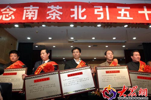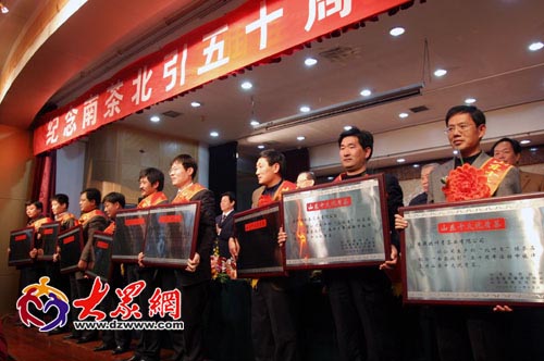 纪念“南茶北引”功勋奖获得者 今天上午,山东省纪念“南茶北引”五十周年大会在济南召开,省政协副主席、党组副书记王修智,省人大常委会副主任陈延明,副省长贾万志,省老领导陆懋曾、王裕晏等出席了会议。 据了解,在经过了几十年的奋斗与发展,“南茶北引”由失败走向成功,如今,山东茶已经遍布齐鲁大地,孔子故里曲阜、泰山脚下、灵岩寺边都有了茶园。青岛的崂山、胶南;日照的东港、岚山、莒县;临沂的莒南、临沭、蒙阴、沂水;威海的文登、乳山;潍坊的诸城等地也已成为优质鲁茶产地。目前,山东茶产区坚持推广无公害生产,茶叶品质通过了欧盟的层层检查,已经领到了通向国际的通行证。“南茶”已根植于齐鲁大地,变成了地道的“鲁茶”。 会上,由省农业厅、省茶文化协会、省质量评价协会联合组织的“山东十大名茶”、“十大优质茶”评选活动正式揭晓。按照企业自愿申请、主管部门初审推荐和专家组评审相结合的办法,浮来青、碧波清锋、茗家春、百满、御园春极品茶、共青绿、碧芽春、大白银剑、春山雪芽、北崂春毫入选“山东十大名茶”;景阳春、天籁馨、极北云岫、瑜山翠龙、北极春、茗园绿茶、北叶青、玉芽茶、沂蒙沁园春银针、杰青芽入选“山东十大优质茶”。