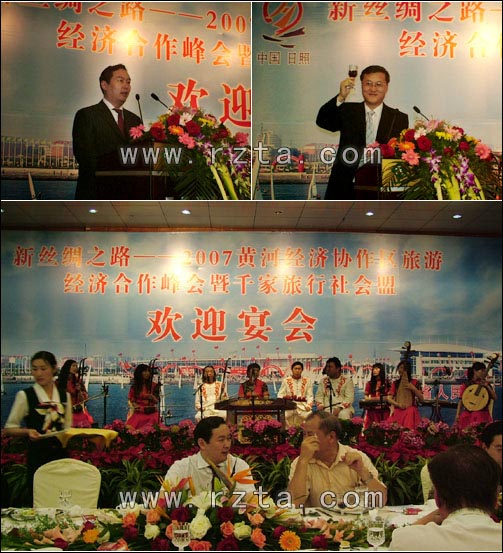 慢慢丝绸路,悠悠黄河情。5月17日晚,山东省人民政府和日照市人民政府举行欢迎宴会,热烈欢迎前来参加‘新丝绸之路——2007黄河经济协作区旅游经济合作峰会暨千家旅行社会盟’活动的嘉宾和代表。