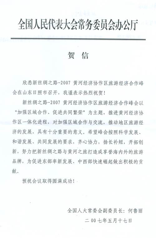 5月18日,新丝绸之路—2007黄河经济协作区旅游经济合作峰会暨千家旅行社(日照)会盟隆重开幕。 本次盛会得到了全国人大常委会、国家旅游领导的高度重视。全国人大常委会何鲁丽副委员长和国家旅游局特地向大会组委会专门发来热情洋溢的贺信,祝大会圆满成功!