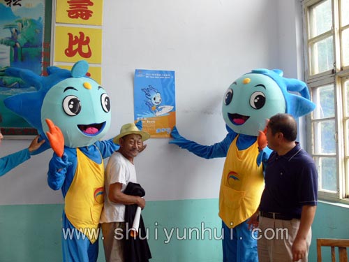 8月3日上午,6名大学生志愿者身着水运会吉祥物水娃卡通装来到石臼敬老院,与老人们一起歌唱、跳舞、畅谈,并为老人们发放张贴水运会八大赛项招贴画,把水运会带来的吉祥、幸福与快乐送给敬老院的每一位老人。