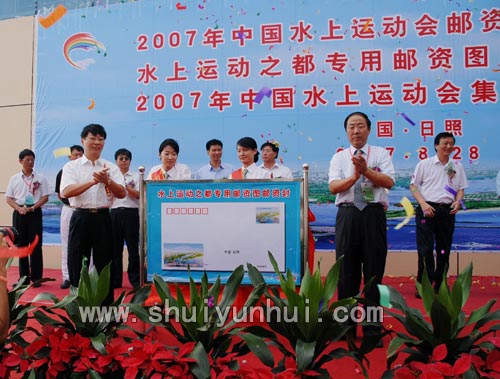 陈必昌、解世增为“水上运动之都”中国日照专用邮资图案、邮资信封揭幕.