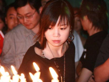 一位女孩点燃蜡烛为遇难者祈祷