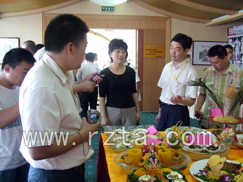 展厅里人头攒动、好不热闹。“祥龙迎奥运”、“扬帆日照”、“海韵”、“海上争艳”等这些别出心裁的菜名,以及福娃的设计, 五环标志等 ,充分体现了厨师们的独特创意和精湛技艺,让现场宾客大开眼界,赞不绝口,纷纷掏出相机、手机频频拍照。
