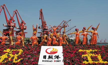 4月26日,日照港西港区,蓝天碧海,巨臂林立,来自日照港及社会各界的劳动者代表聚集在这 里,庆祝即将到来的“五一”劳动节——由中共日照市委、日照市人民政府、山东电视台共同举办的庆祝“五一”劳动节特别文艺晚会在这里录制。市委副书记、市长赵效为,山东电视台总编辑祝丽华,山东省总工会副主席伊戈扬,市委常委、宣传部长毛继春,市人大常委会副主任高丽萍,市政协副主席戚素芬出席并观看晚会。 “咱们工人有力量,嗨,咱们工人有力量!”随着音乐响起,港口劳动者齐声高唱着这首经典的《咱们工人有力量》,歌声响彻云霄,就此拉开了晚会的帷幕。 以歌曲《九妹》而声名大振的歌手黄鹤翔不但再唱他的拿手好戏,而且还唱了一首主旋律歌曲《细水长流》,一出场就将晚会带到一个小高潮。歌手胡月上台一开口就让人振奋,她要演唱的第一首歌曲竟然是由温家宝总理作词、她本人谱曲而成的《仰望星空》,歌曲唱罢,余音甫落,掌声响成一片。当然,她那首成名曲《黄土高坡》也同样受观众喜欢,一时间,竟成了万人大合唱。连续三次在中央电视台春节联欢晚会上表演小品的演员邵峰,和他的搭档们也出现在日照港的舞台上,他们以日照港职工为原型创作的小品《最佳人选》,再现了日照港人无私奉献、爱岗敬业的精神。山东电视台、日照电视台和日照港集团的主持人们则用一首诗歌《在一起》,讴歌建设者们的付出,憧憬日照港的美好未来。 在这样一场庆祝劳动者节日的晚会上,当天谁是最“耀眼”的人呢?当然是被称为“铿锵玫瑰”的女子叉车班的姑娘们和两名优秀农民工。 ——15名女子叉车班的姑娘走上舞台,她们合唱的《铿锵玫瑰》,让人们看到这群用绣花手创造了奇迹的姑娘们工作之外的另一面。或许,她们的合唱有着明显的瑕疵,但没有人注意这个,热烈的掌声告诉我们,她们是当之无愧的铿锵玫瑰。 ——他们走上舞台,显得那么紧张,只是简单地介绍自己是“日照港建安公司的钳工安丰军”、“金海岸装卸公司的装卸工苏日强”,但主持人告诉大家,他们是日照港12000名农民工中的杰出代表,他们是创造了无数业绩和荣誉的“全国优秀农民工”。主持人李敏给了他们最真诚的拥抱,祝他们节日快乐;观众则用最热烈的掌声褒奖他们身边的“明星”。