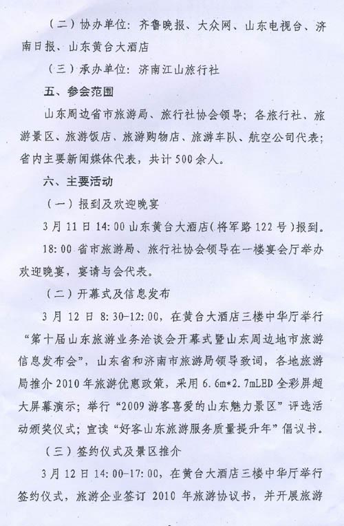 各旅游企业: 3月11至13日,济南市旅游局、山东省旅行社协会联合主办的“第十届山东旅游业务洽谈会暨山东周边地市旅游信息发布会”将在山东黄台大酒店举办,济南市旅游局给我市发出诚挚的邀请(详见附件),请有意参加的旅游企业于3月9日前将名单报市旅游局市场科,于3月12日14:00前到山东黄台大酒店报到。 附:第十届山东旅游业务洽谈会暨山东周边地市旅游信息发布会邀请函