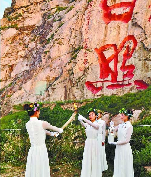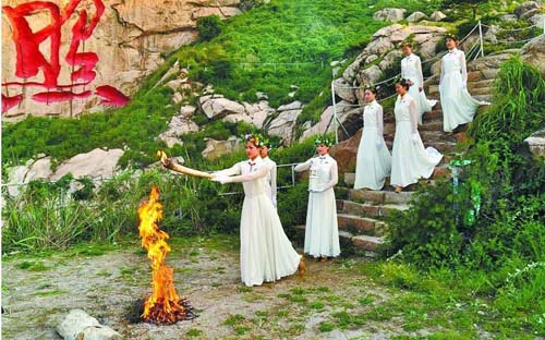 当日,河山之巅薄雾轻绕,当远处海面上第一缕曙光升起时,汉字摩崖巨书“日照”越显壮丽。观景台上,8名远古装扮的舞者开始翩翩起舞,一位老者在舞者环绕下转动着手中的采火棒,2010年中国水上运动会圣火开始以最古老的钻木取火方式采集。