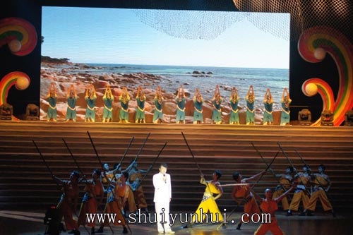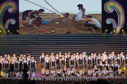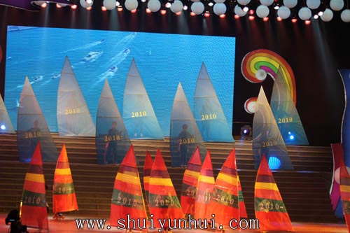 9月8日晚,2010年中国水上运动会闭幕式大型文艺演出在日照会展中心隆重举行。本次晚会以《水运之恋》为主题,从运动员的视角,分五个篇章描绘了日照这座“日出初光先照”的美丽城市留给他们的深刻印记,并用寄往不同城市、不同人物的明信片,串接起一份份如阳光般温暖的感动、如大海般蔚蓝的眷恋,表达着对这座充满朝气的城市的未来最隽永、最灿烂的希冀和祝福。
