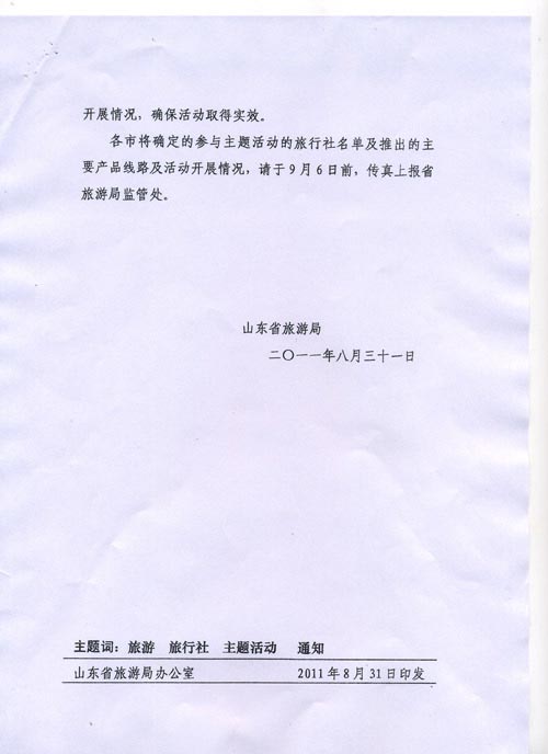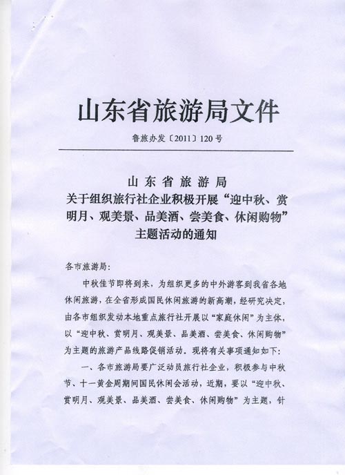 各旅行社: 中秋佳节即将到来,为组织更多的中外游客到我市休闲旅游,按照省旅游局《关于组织旅行社企业积极开展“迎中秋、赏明月、观美景、品美酒、尝美食、休闲购物”主题活动的通知》(鲁旅发[2011]120号)的要求,经研究决定,在全市范围内由开展“迎中秋、赏明月、观美景、品美酒、尝美食、休闲购物”主题活动,各旅行社按照省旅游局文件精神,各自组织好中秋旅游产品线路的设计与促销,并将开展活动和宣传促销的情况与9月5日上午12时前报市旅游局市场科。 附:《关于组织旅行社企业积极开展“迎中秋、赏明月、观美景、品美酒、尝美食、休闲购物”主题活动的通知》(鲁旅发[2011]120号) 二〇一一年九月二日