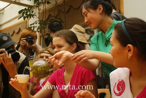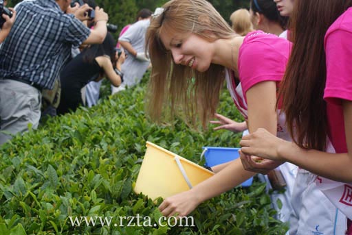 佳丽们亲自采茶、摘叶,对新鲜茶叶充满了好奇,并不时向专业人员询问采茶制茶的技术过程,吸收了解茶文化。离开茶地,选手们跟随御海湾工作人员来到了品茶坊,在这里,选手们亲自体验到了日照绿茶从烫水中氤氲的过程,并且品尝了由工作人员亲自斟上的绿茶。让她们体验到了采茶品茶的茶园文化。
