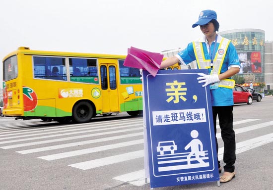 7月12日,市交警直属大队和牵手志愿者协会的志愿者们联合开展了文明交通劝导活动。在活动现场,一些“淘宝体”的交通安全标语,吸引了路人的目光。 当日上午7时许,在城区北京北路与泰安路路口,以“摒弃交通陋习、文明城市牵手行”为主题的交通文明劝导活动拉开了帷幕。一群头戴蓝色志愿帽、身穿黄白相间马甲的牵手志愿者走上街头,向过往行人宣传“文明礼让”出行知识并帮助交警维护交通秩序,成为市区一道亮丽的风景线。