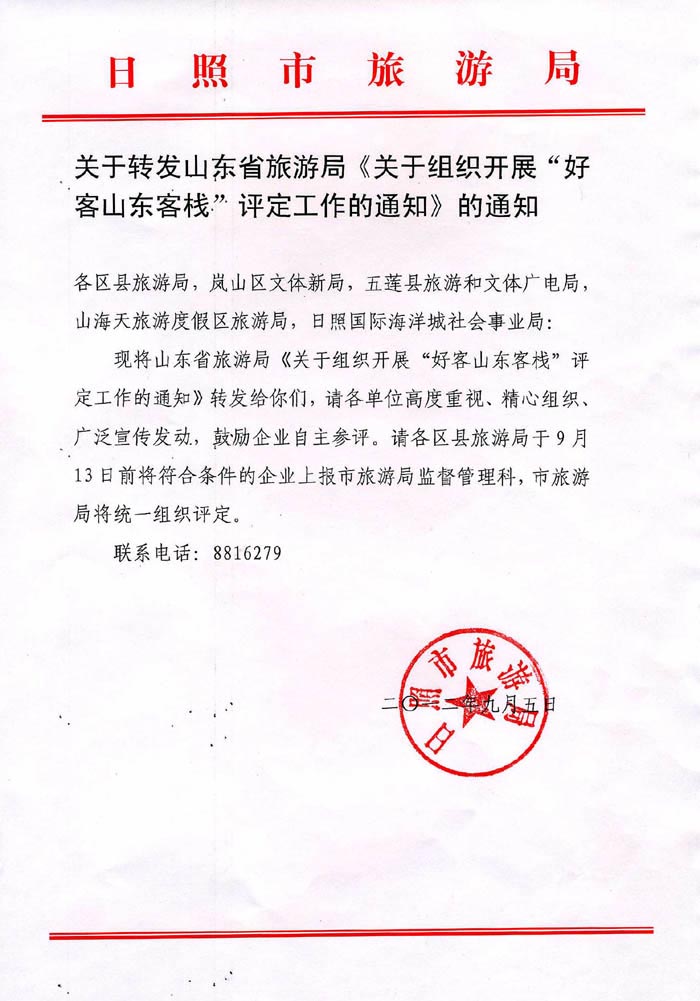 关于转发山东省旅游局《关于组织开展“好客山东客栈”评定工作的通知》的通知(2012年09月07日)