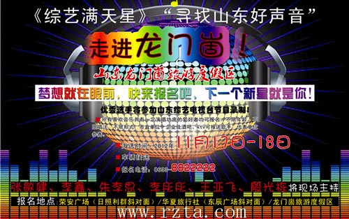 全民大精彩,敢唱你就来。 11月17—18日,李鑫、张敏健、李彤彤、王亚飞、殷光栋、朱李思携手山东综艺频道《山东好声音》走进龙门崮旅游度假区。《山东好声音》—咱山东人家门口的舞台,不限年龄,不限唱法,不限形式,只要你敢唱,所有喜欢音乐并有一定演唱功底的爱好者均可报名。综艺频道全程录播,晋级选手将进入《山东好声音》的复赛舞台,录制晋级比赛。《山东好声音》是龙门崮继《快乐大PK》之后,与山东综艺频道联手推出的又一新的全名互动活动,2012,全民都互动,共创大精彩,快乐大升级。 详情咨询电话:0633—8822222