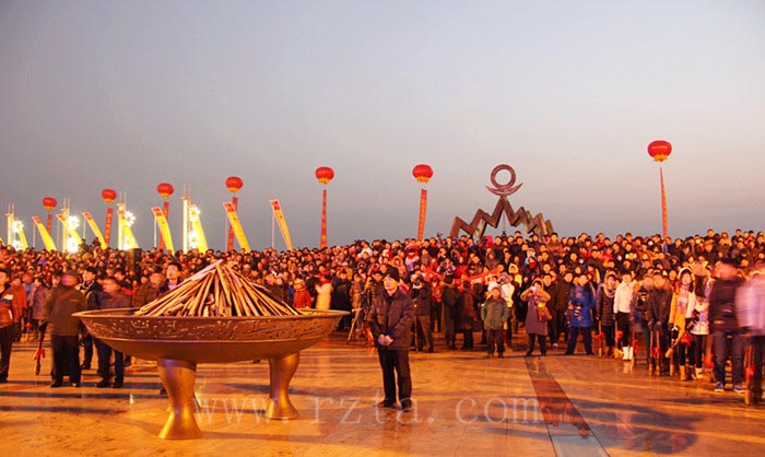 1月1日早上6:30,中国最顶级的女子打击乐团“红樱束”用激昂雄浑的鼓声唤醒沉睡的大地,奏响新年的凯歌;山东省旅游局和日照市的领导共同点燃圣火盆,和观众一起手举火把,跳起“火把舞”,重现远古祭拜太阳的场景;太阳升起的时刻,省市领导共同撞响“太阳圣钟”,伴随着悠扬的钟声,万人一起感恩祈福,许下新年的愿望;活动中还举行了“与太阳合影----哈哈笑拍客行动”,在新年伊始的幸福时刻拍照留念;精彩的动力伞表演在为观众展现优美舞姿时,“天女散花”般从空中洒下2013个幸福彩球和3000张福利彩票,幸运球内含560个最高价值达1000元的大奖,将新年的祥瑞洒向人群,人们在参与活动的同时,还赢得奖品,象征了新年的好兆头。