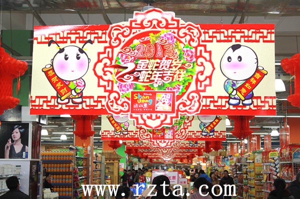 进入二楼超市,各条主通道主要是以“金蛇贺岁”的主题平面设计版面和大红灯笼为主的“年货一条街”主题吊挂,春节的气氛浓郁,效果突出,是本次美陈设计的亮点。