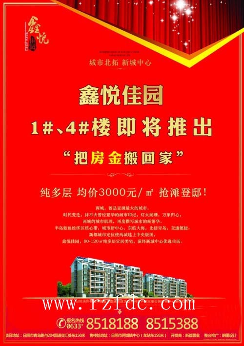 城市北拓,新城中心。鑫悦佳园1#、4#楼即将推出 ,拥有鑫悦佳园就等于您把“房金”搬回家。鑫悦佳园纯多层,均价每平米在3000元,抢滩登邸。