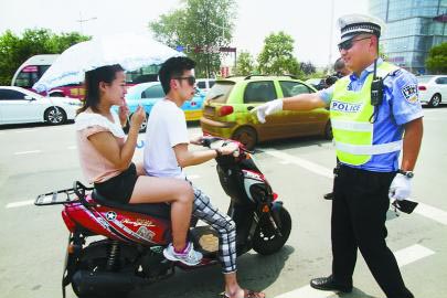 7月16日,海曲路与青岛路交叉路口,室外温度达33摄氏度,市交警直属大队的民警提醒摩托车驾驶员应佩戴安全头盔。随着我市旅游旺季的到来,市交警部门组织警力驻守主要交通路口,指挥疏导交通,提醒司机安全谨慎驾驶,并帮助游客及市民处理各种应急问题。
