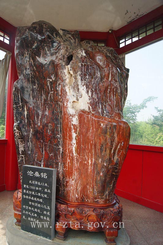 从鱼古亭向东数步,便见一古亭,亭中有一尊巨大的树化石,高约3米,重达7500公斤,号称齐鲁第一树化石,古树历经两亿五千万年的沧海桑田,自然的鬼斧神工已将其变成一块巨大的玛瑙。抬头仰视,亭上有一匾额,上书“沧桑亭”,让人豁然顿悟,一切尽在其中。