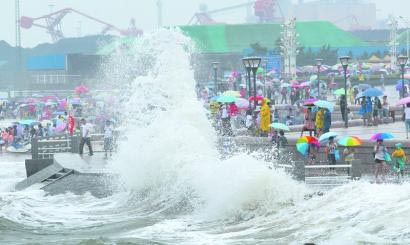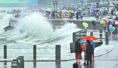 8月9日下午,整个港城笼罩在淅淅沥沥的雨中,又适逢涨潮,在灯塔风景区的海边,汹涌的海水惊涛拍岸,吸引了众多游客观潮。