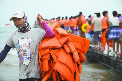 8月16日,日照海滨景区的工作人员为乘坐游艇的游客准备了大量的救生衣。 近年来,随着我市生态环境和旅游服务质量的改善与提升,越来越多的游客把日照作为旅游的首选之地,而我市也秉承旅游要发展,游客是根本,安全大如天的原则,对安全生产责任落实情况、安全隐患排查治理制度、游客安全保障制度等进行不定期的旅游安全生产大检查,有效防范和坚决遏制旅游安全事故的发生,切实保障广大游客的生命财产安全。