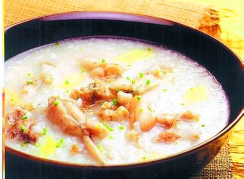 百合田鸡粥田鸡去皮、去内脏,斩件;猪瘦肉洗净,切片。太子参、百合、大米、葱、青豆等洗净。将大米(或粳米)放入开水锅内,煮开后,放入太子参、百合、青豆等,以武火煮开后,再放入猪瘦肉、田鸡,以文火煮至粥成,放入葱粒调味。它具有清润肺燥,益肺生津,清心安神的作用。