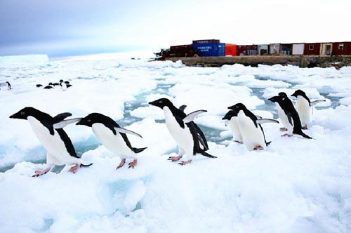 1月9日,一群阿德雷企鹅从中山站前列队走过。 1月份的南极大陆迎来温暖的夏季,进入繁殖期的企鹅成群结队地溯游至大陆沿岸和岛屿筑巢繁殖。位于拉斯曼丘陵协和半岛的中山站时常有企鹅光顾,数量可达数百只。