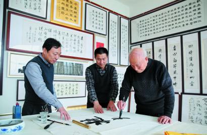 1月12日,在莒县刘官庄镇,今年77岁的中国书法家协会会员盛荣桂(右一)正在创作。 当日,记者从莒县工商局获悉,莒县直接或间接的书画行业从业人员达3000余名,书画作品遍布大江南北,书画产业逐渐形成规模。 日前,莒县因书画艺术被文化部命名为“中国民间文化艺术之乡”。