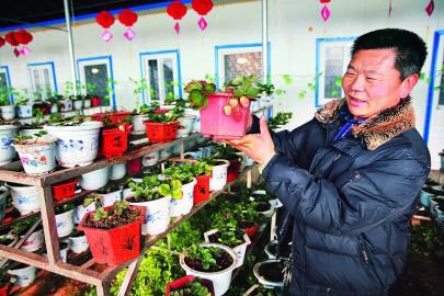 1月19日,莒县小店镇洪山家庭农场的草莓大棚内,村民魏洪山在展示利用立体无土化栽培技术种植的草莓。目前草莓已进入成熟期,开始接待市民采摘。 据魏洪山介绍,立体种植不仅方便市民采摘,还有效地节约了土地,产量为普通种植方法的3倍。