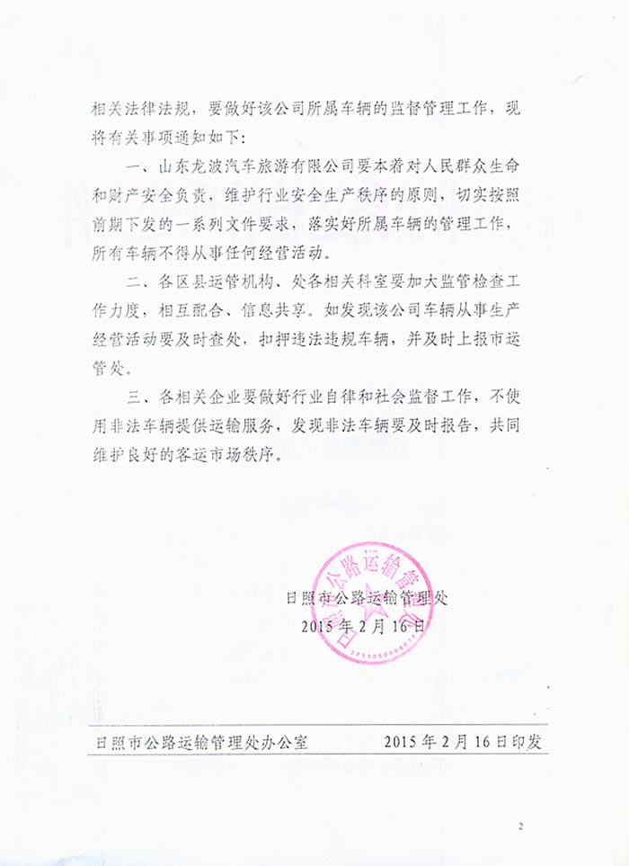 日照市公路运输管理处关于加强山东龙波汽车旅游有限公司客车监督管理工作的通知(2015年03月02日)