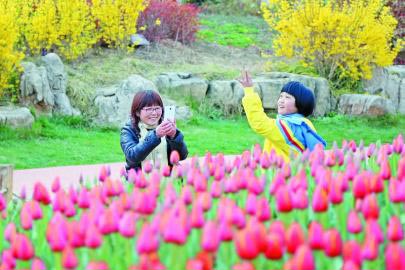 4月6日,日照市植物园,市民在含苞待放的郁金香前拍照。 记者当日在植物园看到,园内的27万株郁金香,演绎着春的五彩斑斓,美艳的花朵,浓郁的花香,吸引了不少游客前去一饱眼福。据了解,每年的四、五月份是郁金香的盛开期,花期一般持续三至四周,市民在此可欣赏到各种春花次第盛放的美景。