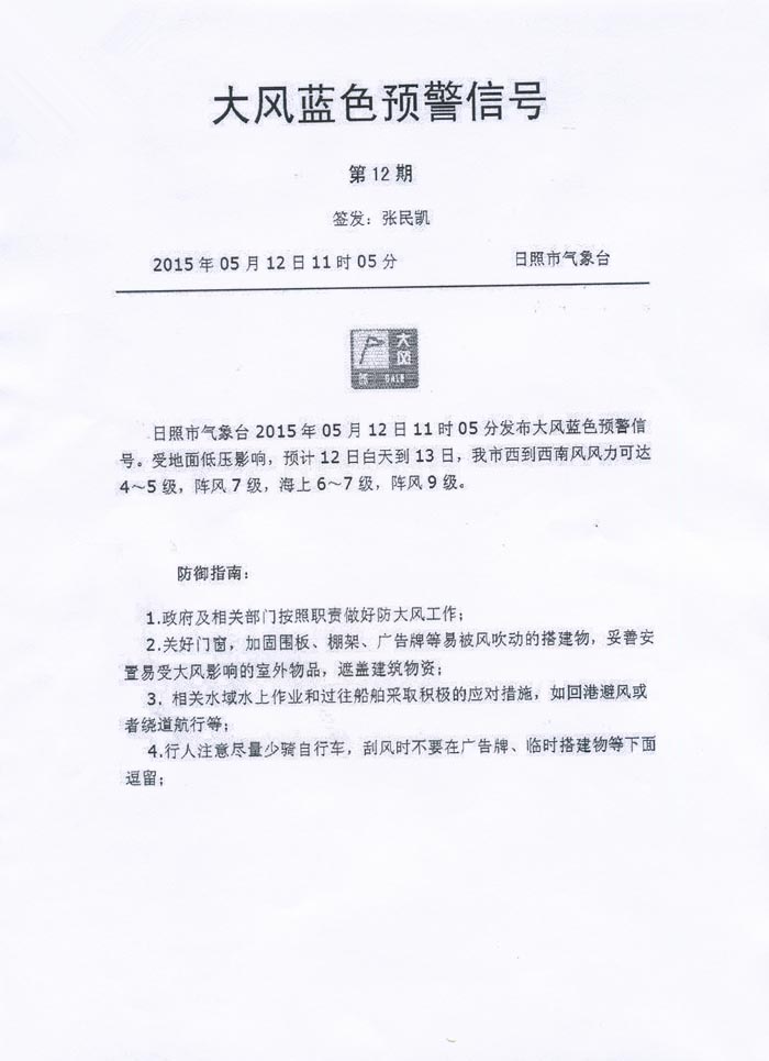 关于转发日照市气象台《大风蓝色预警信号》文件的通知(2015年05月12日)