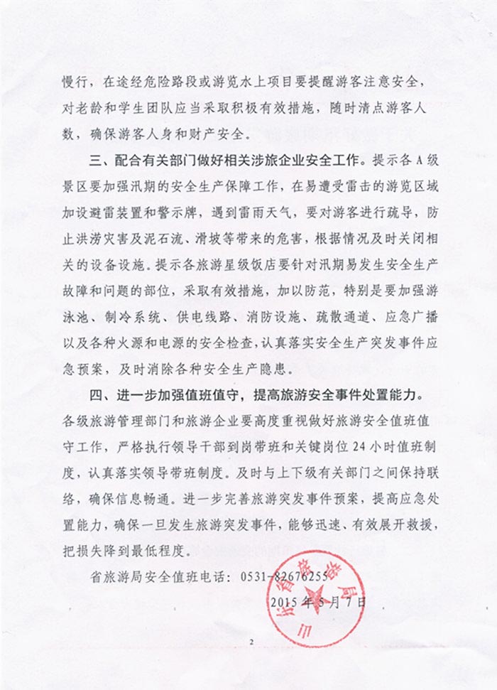 关于转发《山东省旅游局<关于做好汛期旅游安全工作的紧急通知>》的通知(2015年05月18日)