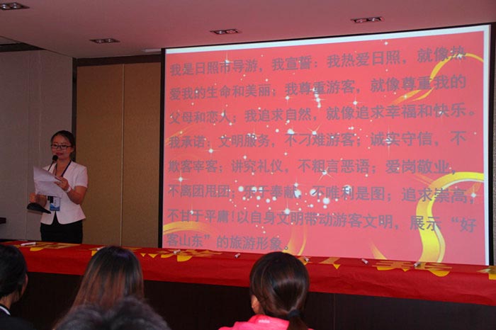 “我是日照市导游,我宣誓:我热爱日照,就像热爱我的生命和魅力;我尊重游客,就像尊重我的父母和恋人;我追求自然,就像追求幸福和快乐;文明服务,不刁难游客……以自身文明带动游客文明,展示‘好客山东’的旅游形象”。