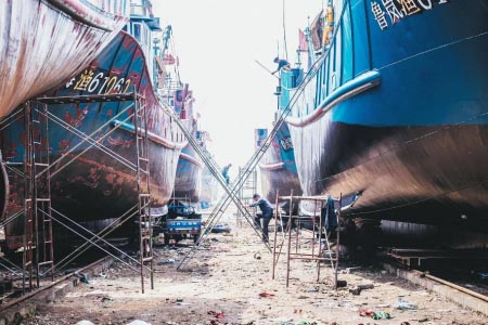 5月26日,距离黄渤海休渔期还有5天时间,不少渔民提早封网上岸,开始为期3个月的“休假”。 当天,阜新渔港海面风平浪静,近百艘渔船整齐停靠岸边。刚靠岸不久的渔民正忙活着把网具卸下渔船,离开海的渔网没了一丝气势,被蜷成一团塞进三轮摩托的车斗。更早些进港的渔船要么空无一人,要么只有三三两两用衣帽、挡风镜、口罩把脸捂得严严实实的工人处理船体的脱漆。 “每年到了休渔期都得重新涂刷船漆。不然海风吹、海水泡、还有附着的海洋生物的侵蚀,会缩短船的寿命。”秦船长拥有1条100多吨的铁壳船,他指了指身后正在打磨驾驶舱外壁脱漆处的工人,“脱漆的地方要先打磨再上漆,上了漆晾凉之后再上漆,前前后后得刷5、6遍,然后再‘上坞’保养,整体重新涂漆。” 秦船长所说的“上坞”就是把船驶进船厂拖上岸进行维修保养。 “像铁壳船的正常保养都要20天左右的时间。轮机系统、渔捞设备都是保养的重点内容,其实跟汽车保养没太多的区别,最不一样的就是像休渔期这样每年一次的保养都要重新上一遍漆。”谈起渔船保养,船厂孙师傅滔滔不绝。“木质船用桐油和防污漆,铁壳船就得用氯化橡胶面漆和防污漆。像木质船主要检验船体水线以下蛆蚀严重、捻缝漏水等问题,而铁壳船主要检验外板是否有变形、裂缝,焊缝是否有漏水现象等内容。 在渔码头深处的船厂,刚刚上岸的铁壳船沿着轨道整齐列队,千里的浪万里的风斑驳了它们的漆面,一人高的螺旋桨终于告别脱海蓝,拥抱天蓝。船厂工人的身影在机舱、在甲板、在铁梯、在脚手架……为渔船的新颜忙碌。三个多月后,不知秦船长的笑颜能否在渔船的新颜里绽开。 “我还是很支持休渔的,现在出海成本越来越高,更希望每次出海的捕捞量能大些,但好多时候现实不那么理想。”秦船长顿了顿,摆摆手,从岸边跳下船,健步如飞地走在凹凸不平的船上。
