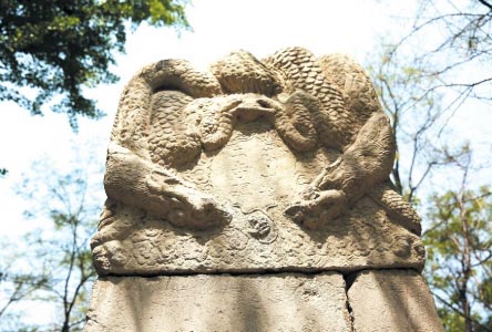 穿插走过一段林荫小道,我们找到了蟠龙碑。从建寺开始,净土寺经历了1000多个春秋,留下来的古物已经不多,它的出现让我们惊讶不已。它无声地讲述着一个被湮没的真实故事,一个被埋葬的神圣敬畏。元代皇庆二年净土寺奉敕重修,立蟠龙碑。蟠龙碑帽雕有两条蟠龙,碑文因风雨剥蚀,大部已难辨认。但从两条蟠龙利爪间捧出“碁山净土寺”五个大字可以看出,此寺是皇室成员佛门修行的替身寺庙,是皇家寺庙。此次重修,使净土寺逐渐成为莒州名寺之一。重修后,由于钟鼓之声别具一格,所以净土寺列为莒州外八景之一——— 山寺晚钟。