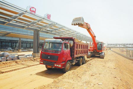 6月11日,工人正在航站楼前施工。目前,日照机场建设各项工作进展顺利。土石方工程已完成并通过华东局质监站验收;航站楼、综合服务中心工程主体已完成,正处于装修阶段;跑道道面已贯通;航管楼、塔台等工程正在加紧推进;气象、空管设备正在安装。