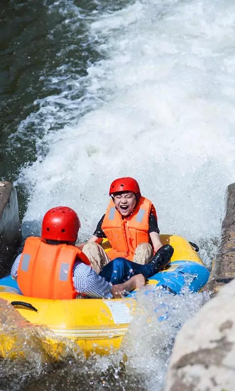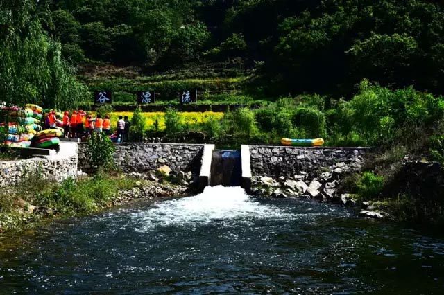烈日当头,在游客中心,早有一些游客赶来玩水避暑,穿戴好防护衣,等待出发.兴奋和忐忑中下了水,还没等在水里畅享够那种荡悠悠的感觉,就顺着水流冲下第一道险坡。啊——!人们尖叫着,随飞瀑“飞流直下”!要的就是这个滋味,爽呆了!太刺激了!