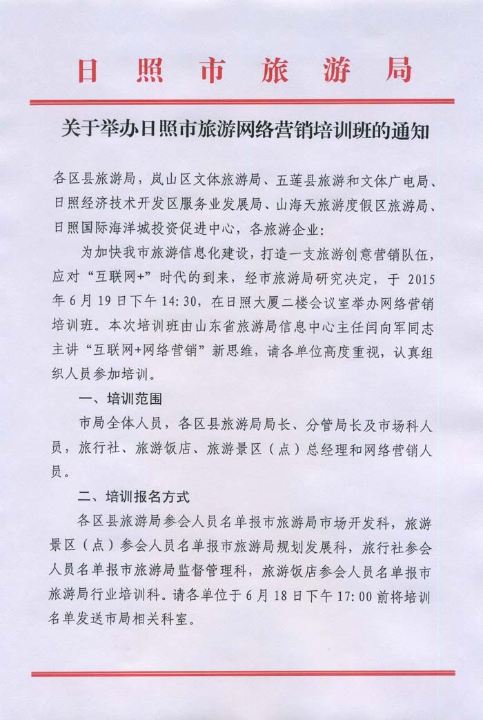 关于举办日照市旅游网络营销培训班的通知(2015年06月17日)