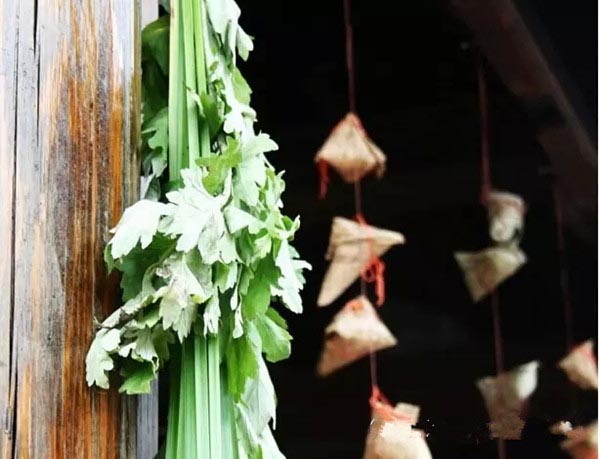 端午那天长辈总是早早起床,在太阳升起前给孩子们的手腕、脚腕系上五彩丝线。再去野外采回一大把艾蒿,还要把提前缝制好的香包装上艾叶,据说这样香气大而久可以辟邪。将艾蒿枝挂在自家屋檐下,“清明插柳端午插艾”这老风俗,不知道传了多少年,多少代.