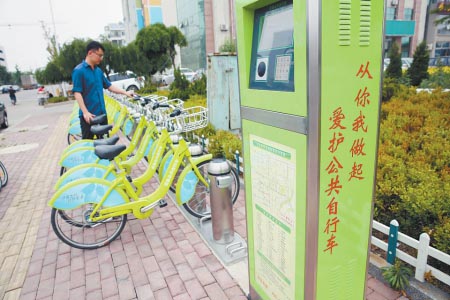 6月23日,市民在莒县一公共自行车租赁站点还取公共自行车。 莒县公共自行车自投放以来,已成为群众短途出行方式的最佳选择,截至目前,全县公共自行车卡开通13545张,累计借车次数1394864次,日平均骑行600余小时,日骑行次数最高突破5000次。