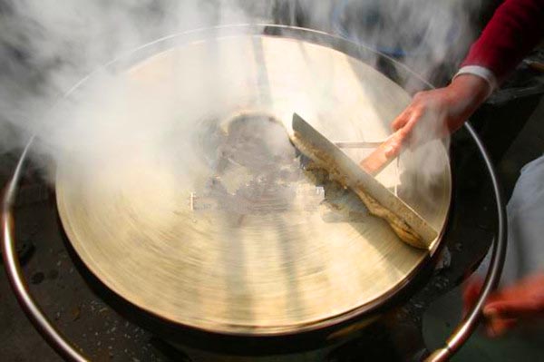 清代蒲松龄曾作过一篇《煎饼赋》,里面写到“(煎饼)圆于望月,大如铜铮,薄似剡溪之纸,色如黄鹤之翎”。“味松酥而爽口,香四散而远飘”,正宗的山东煎饼正是如此。